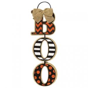 Boo MDF Halloween hanging sign with burlap bow. Perfect for your door or entry. Size: 45cm x 15cm