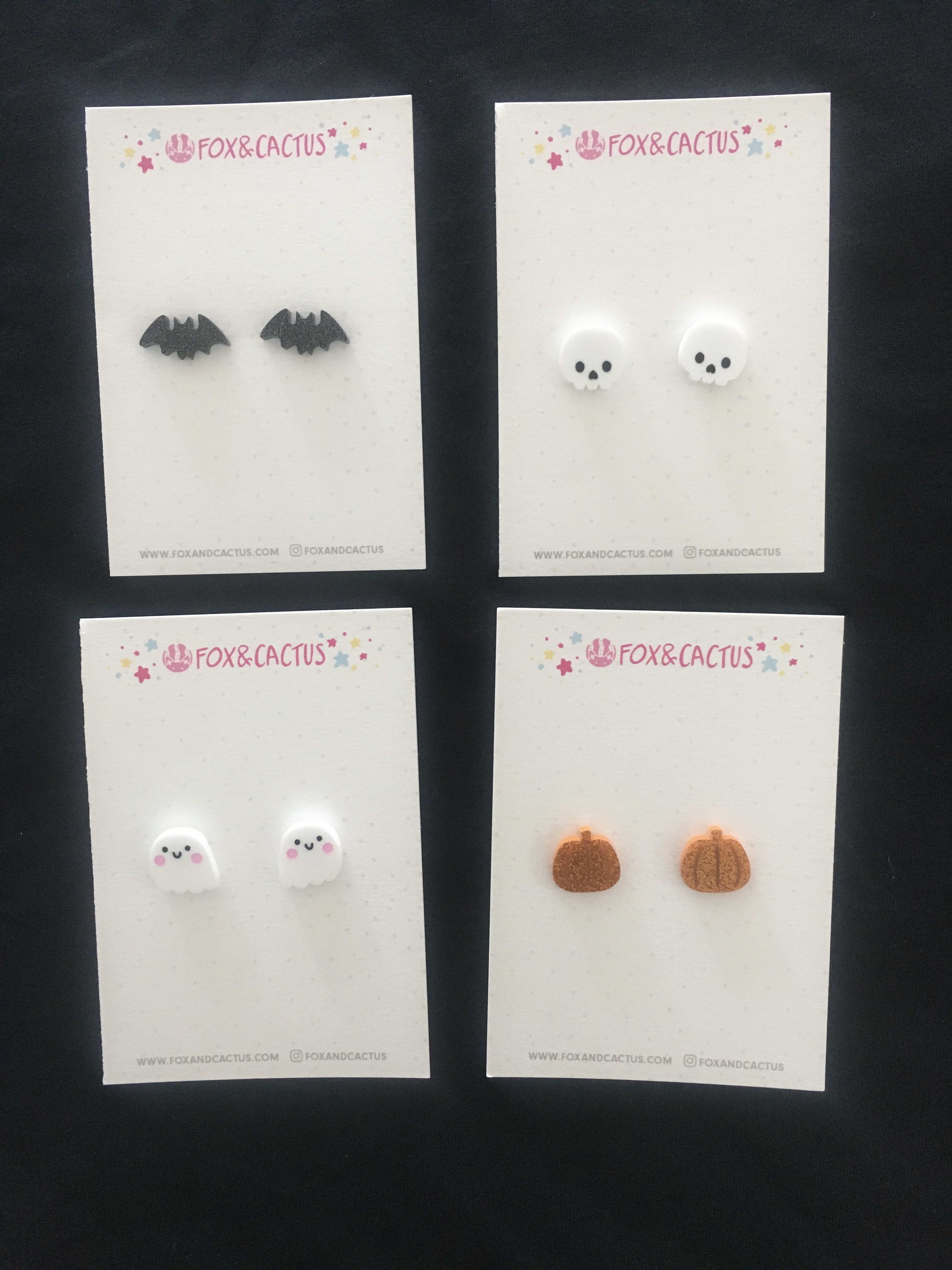 Show off your spooky side with these super cute earrings! Acrylic hypoallergenic surgical stainless steel posts, perfect for sensitive ears. Available in the following designs: Black glitter Bats 2cm wide Skull 1.5cm wide Happy Ghost 1.5cm wide Orange glitter Pumpkin 1.5cm wide